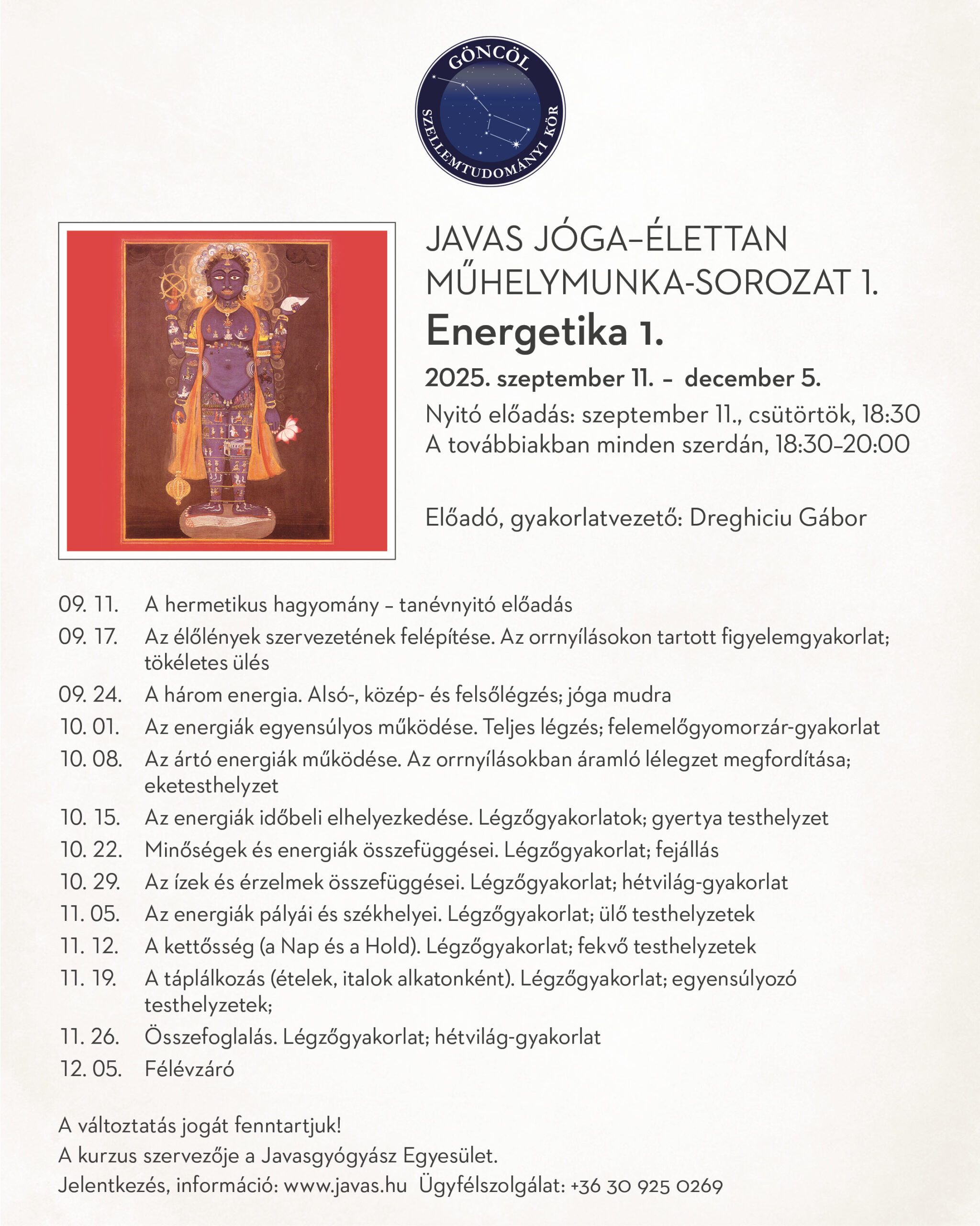 Tematika: Az élőlények szervezetének felépítése; A három energia; Az energiák egyensúlyos működése; Az ártó energiák működése; Az energiák időbeli elhelyezkedése; A minőségek és az energiák összefüggései; Az ízek és az érzelmek összefüggései; Az energiák pályái és székhelyei; A kettősség (Nap és Hold); A táplálkozás (ételek, italok alkatonként)